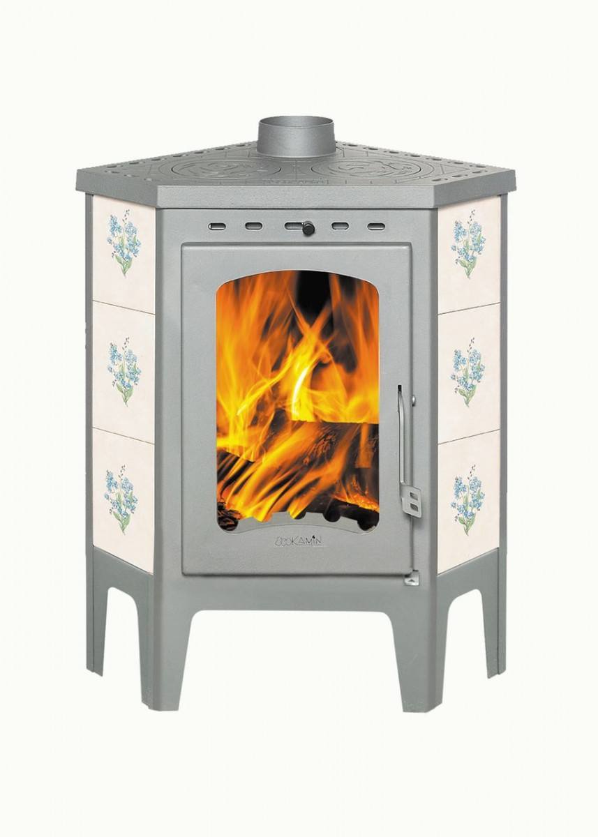 Печь-камин Бавария угловая с плитой незабудка с цельносварной топочной камерой и футеровкой из шамотного кирпича