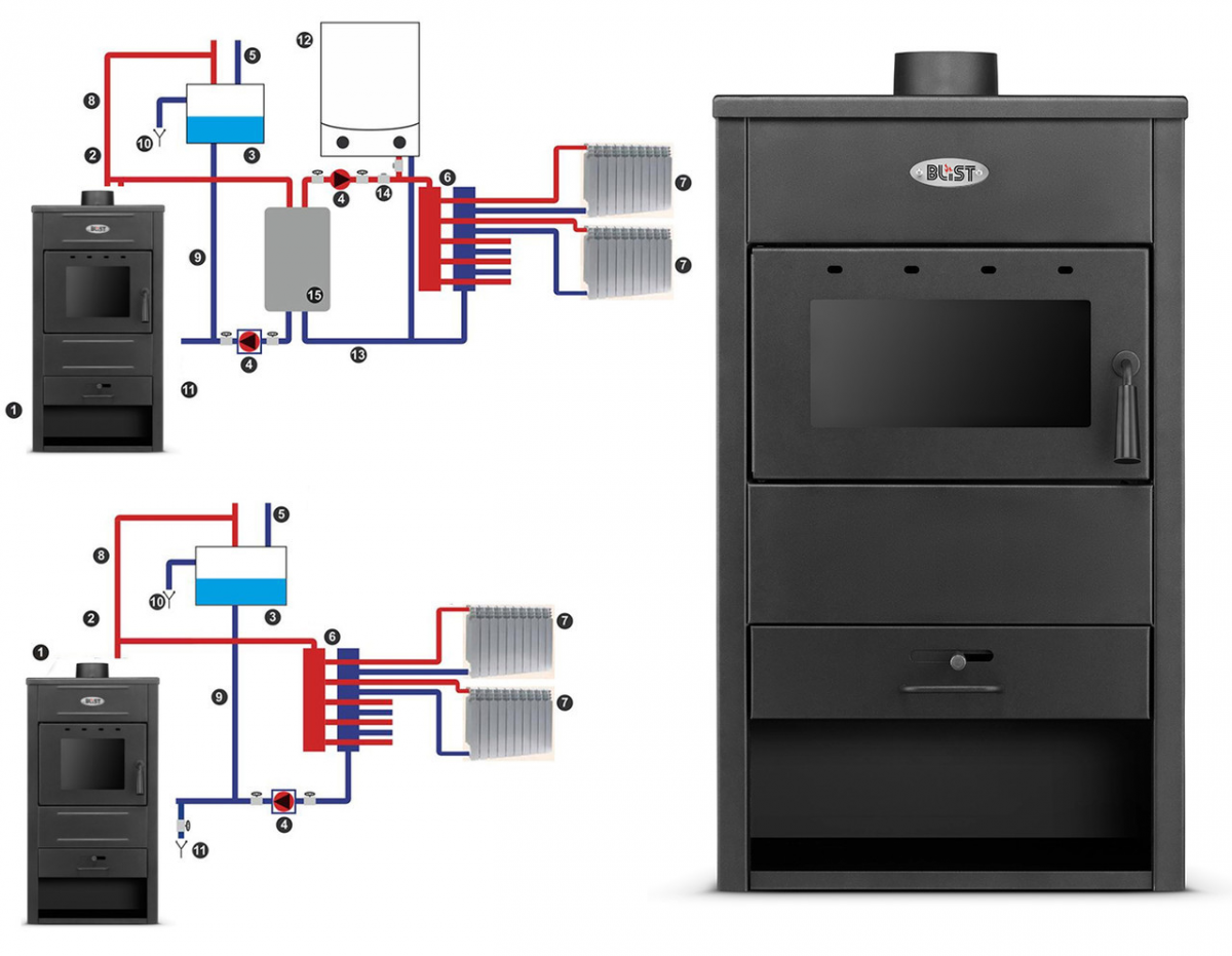 Такие теплообменники устанавливаются в верхней части топочной камеры, когда в модели Padova E, как и у отопительных котлов, имеется водяная рубашка, окружающая топочную камеру почти со всех сторон. Благодаря этому печь-камин Blist Padova E имеет номинальную мощность водяного контура 14.6 кВт, а в помещение, в котором она установлена, она отдает 4.1 кВт. Данные характеристики приближают печь по своему функционалу к небольшим отопительным котлам, но, в отличие от котлов, ее можно установить в гостиной и наслаждаться красотой огня.