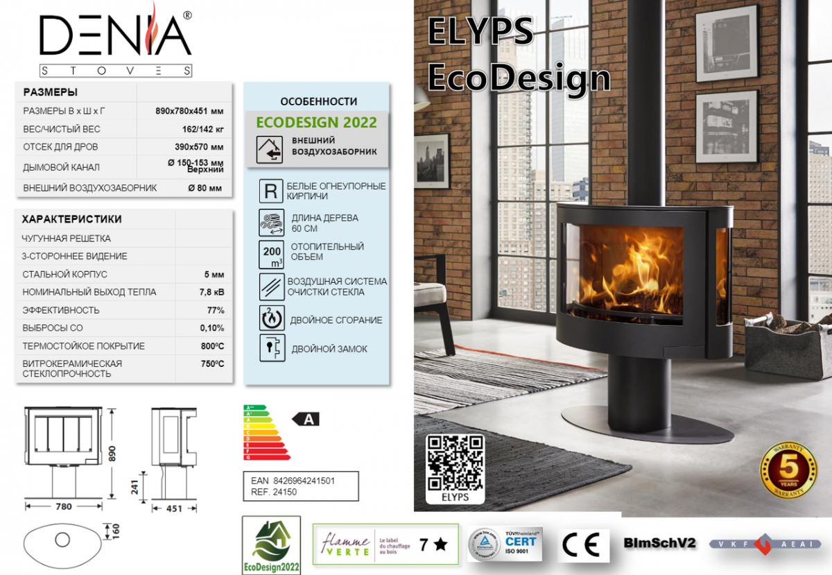 Печь-камин Denia Elyps, мощность 7,8 кВт, отапливаемый объем 200 м3, длина дров 60 см