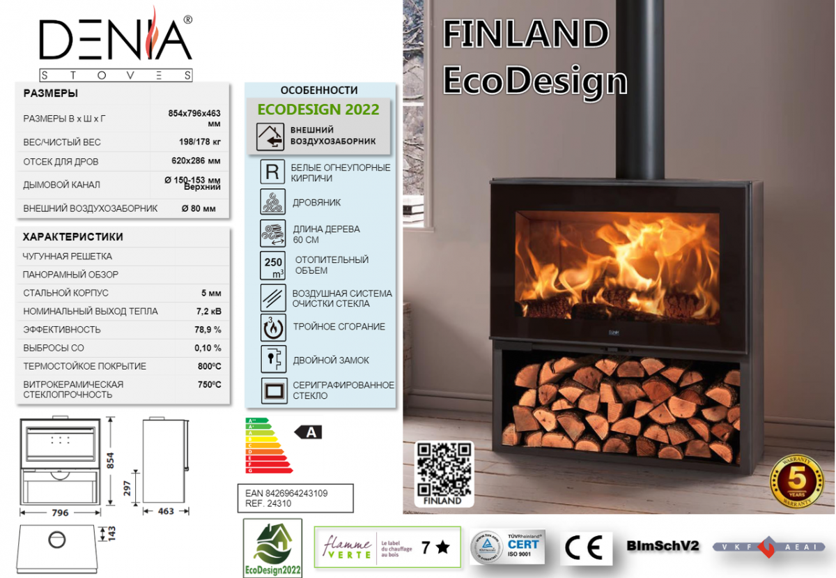 Печь-камин Denia Finland, мощность 7,2 кВт, отапливаемый объем 250 м3, длина дров 60 см