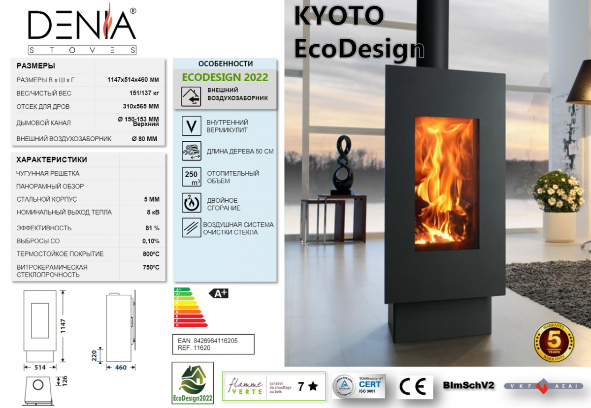 Печь-камин Denia Kyoto, мощность 8 кВт, отапливаемый объем 250 м3, длина дров 50 см
