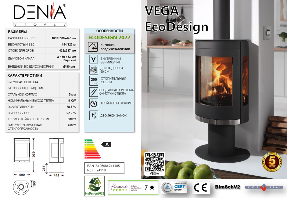 Печь-камин Denia Vega, мощность 8 кВт, отапливаемый объем 200 м3, длина дров 50 см