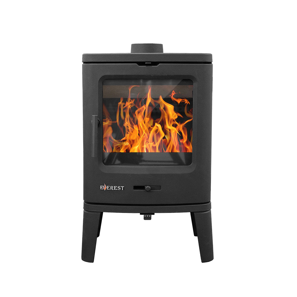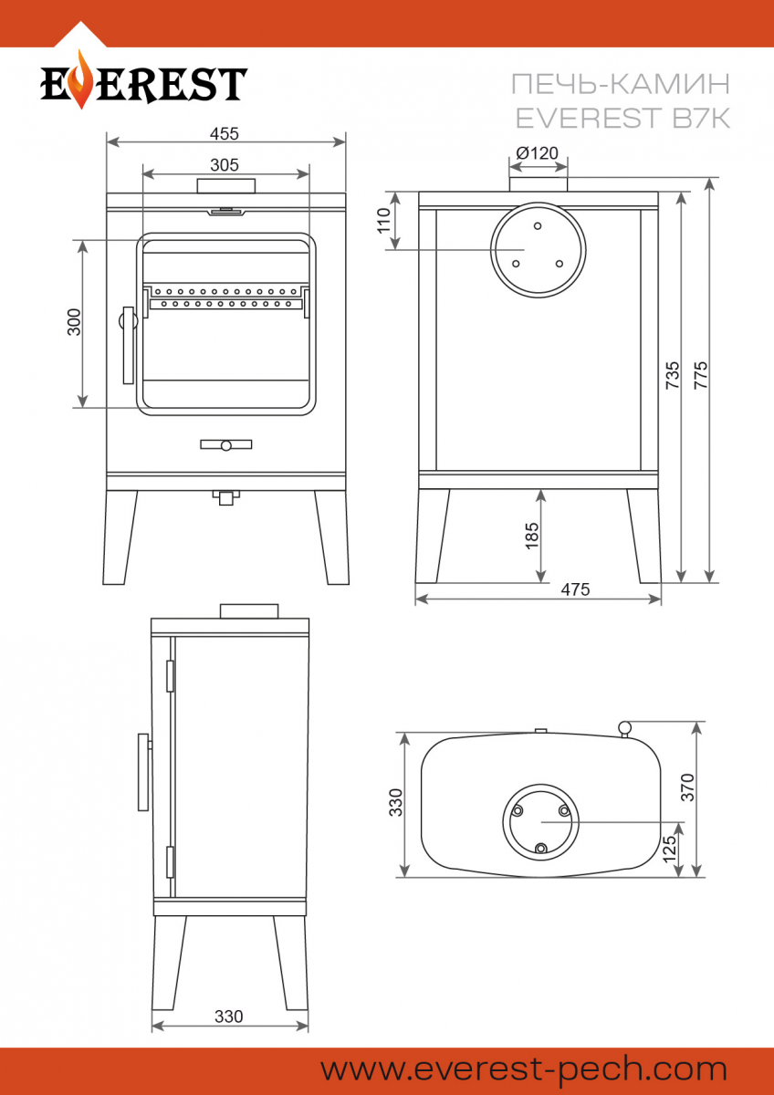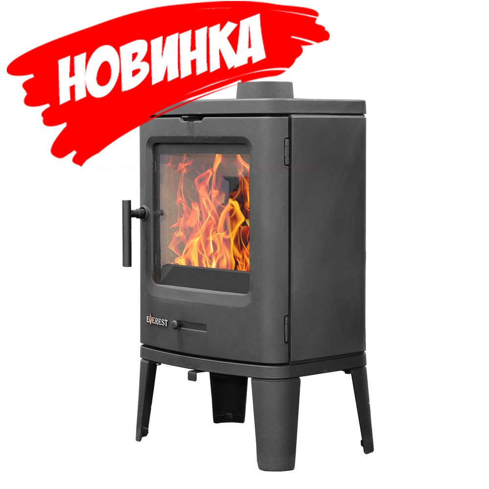 Компактная, стильная и мощная новинка от компании Everest. Печь-камин изготовлена из качественного жаростойкого чугуна ГОСТ 141285 с толщиной стенок 6-8 мм. Модель мощностью 7 кВт, рассчитана на обогрев помещений объёмом до 140 м³. Печь-камин имеет вермикулитовый пламегаситель. На чугунной дверке предусмотрена ручка с регулировкой силы прижатия. Топка усилена вермикулитовыми плитами с системой двухуровневого вторичного дожига. С помощью этой функции по специальному каналу поступает воздух, который нагревается при прохождении между топочной камерой и задней стенкой корпуса. Далее нагретый воздух через дефлектор поступает в топку, перемешивается с газами - продуктами горения, чем вызывает повторное возгорание. Регулировка этой системы, осуществляется заслонкой, расположенной в нижней части печи-камина. Регулировка подачи воздуха в колосниковую зону осуществляется заслонкой, расположенной на двери. В верхней части расположена ручка регулировки системы чистое стекло, которая помогает оставаться стеклу чистым отсекая сажу и копоть воздухом, подаваемым с верхней части топки. Патрубок дымохода Ø 120 мм – универсальный, со сменным положением. Он может быть установлен сверху или сзади в зависимости от размещения печи в помещении.