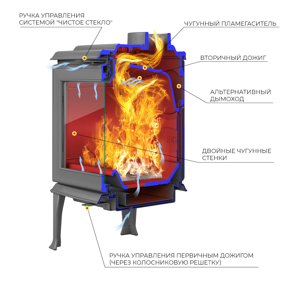Печь-камин EVEREST F11 изготовлена из качественного жаростойкого чугуна (ГОСТ 1412-85) с толщиной стенок 6-14 мм. Вес печи составляет 130 кг. Модель рассчитана на обогрев помещений объёмом до 220 м³. Топка Печи камина усилена чугунными вставками с системой вторичного дожига. С помощью этой функции по каналам подачи вторичного воздуха поступает воздух, который нагревается при прохождении между топочной камерой и стенками корпуса. Далее нагретый воздух через дефлектор поступает в топку, перемешивается с газами - продуктами горения, чем вызывает повторное возгорание. Над дверцей печи-камина расположена система чистое стекло, которая помогает оставаться стеклу чистым. В нижней части дверцы расположена ручка для регулировки подачи воздуха в колосниковую зону. Патрубок дымохода Ø 150мм – универсальный, со сменным положением. Он может быть установлен сверху или сзади в зависимости от размещения печи в помещении.