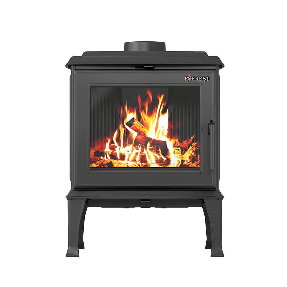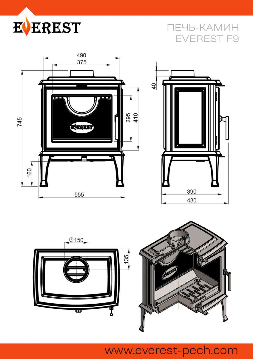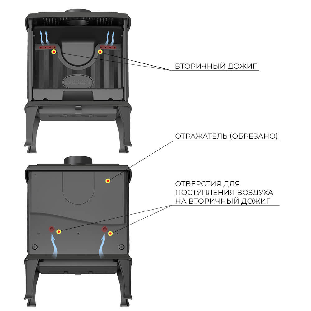 Печь-камин EVEREST F9 изготовлена из качественного жаростойкого чугуна (ГОСТ 1412-85) с толщиной стенок 6-14 мм. Вес печи составляет 130 кг. Модель рассчитана на обогрев помещений объёмом до 180 м³. Топка Печи камина усилена чугунными вставками с системой вторичного дожига. С помощью этой функции по каналам подачи вторичного воздуха поступает воздух, который нагревается при прохождении между топочной камерой и стенками корпуса. Далее нагретый воздух через дефлектор поступает в топку, перемешивается с газами - продуктами горения, чем вызывает повторное возгорание. Над дверцей печи-камина расположена система чистое стекло, которая помогает оставаться стеклу чистым. В нижней части дверцы расположена ручка для регулировки подачи воздуха в колосниковую зону. Патрубок дымохода Ø 150мм – универсальный, со сменным положением. Он может быть установлен сверху или сзади в зависимости от размещения печи в помещении.