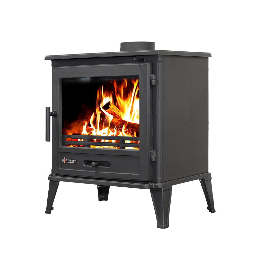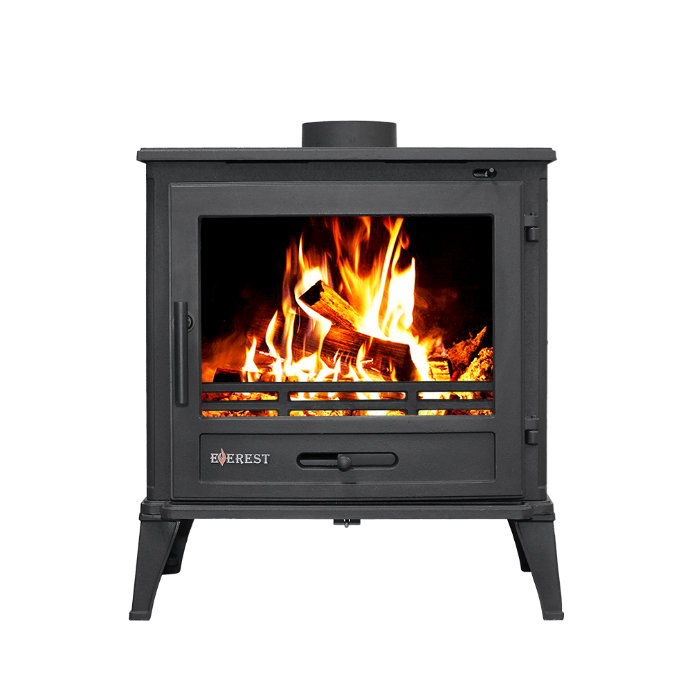 Печь-камин EVEREST М10 изготовлена из качественного жаростойкого чугуна с толщиной стенок 6-8 мм. Модель рассчитана на обогрев помещений объёмом до 200 м³. Печь-камин имеет два пламегасителя: самый нагруженный пламегаситель изготовлен из вермикулита, второй из жаростойкого чугуна. Топка печи-камина усилена вермикулитовыми плитами с системой вторичного дожига. С помощью этой функции по специальному каналу поступает воздух, который нагревается при прохождении между топочной камерой и задней стенкой корпуса. Далее нагретый воздух через дефлектор поступает в топку, перемешивается с газами - продуктами горения, чем вызывает повторное возгорание. Регулировка этой системы, осуществляется заслонкой, расположенной в нижней части печи-камина. Регулировка подачи воздуха в колосниковую зону осуществляется заслонкой, расположенной на двери. В верхней части расположена ручка регулировки системы чистое стекло, которая помогает оставаться стеклу чистым. Патрубок дымохода Ø 150 мм – универсальный, со сменным положением. Он может быть установлен сверху или сзади в зависимости от размещения печи в помещении.