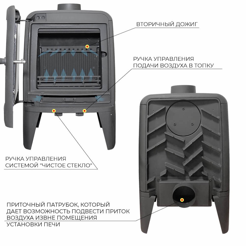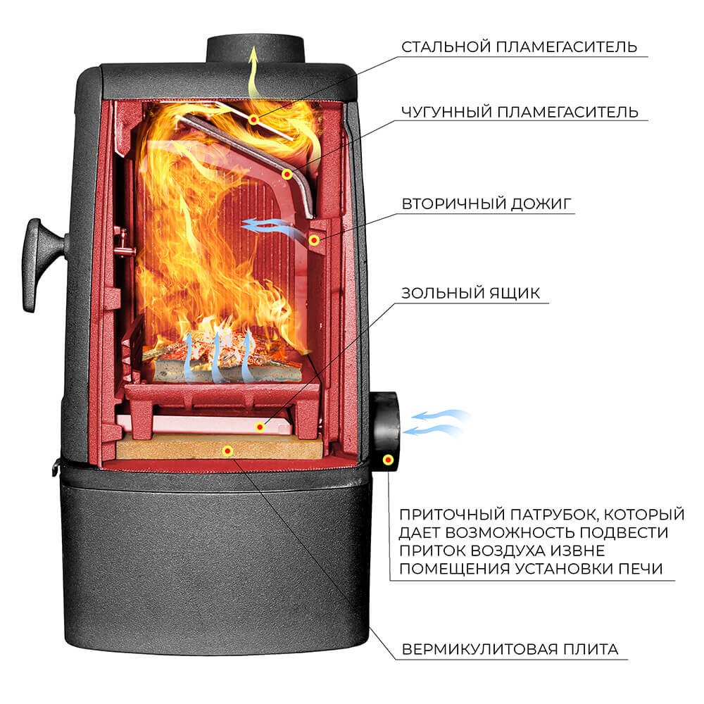 Печь-камин имеет два пламегасителя: самый нагруженный пламегаситель изготовлен из чугуна, второй из стали 09Г2С. Топка печи-камина усилена чугунными плитами с системой двухуровневого вторичного дожига. С помощью этой функции по каналам подачи вторичного воздуха поступает воздух, который нагревается при прохождении между топочной камерой и стенками корпуса. Далее нагретый воздух через дефлектор поступает в топку, перемешивается с газами - продуктами горения, чем вызывает повторное возгорание. Регулировка этой системы, как и подача воздуха в систему чистое стекло, осуществляется заслонкой, расположенной слева в нижней части печи-камина. В правой нижней части расположена ручка регулировки подача воздуха в колосниковую зону.