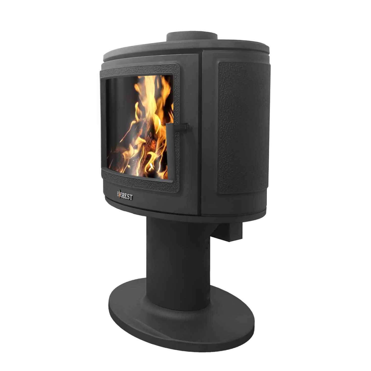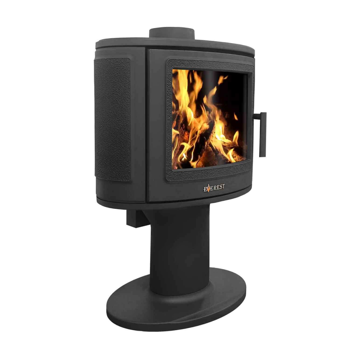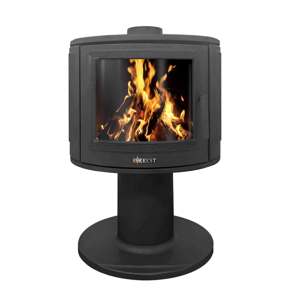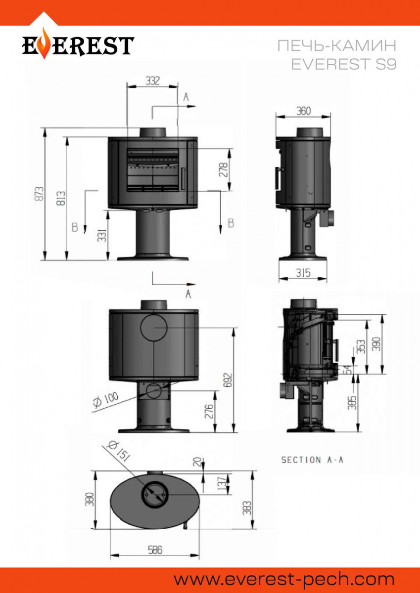 Печь-камин EVEREST S9 и S9M изготовлена из качественного жаростойкого чугуна с толщиной стенок 6-8 мм. Модель рассчитана на обогрев помещений объёмом до 180м³. Печь-камин имеет два пламегасителя: самый нагруженный пламегаситель изготовлен из жаростойкого чугуна (ГОСТ 1412-85), второй из особо прочной котловой стали 09Г2С. Топка печи-камина усилена чугунными вставками с системой двухуровневого вторичного дожига. С помощью этой функции по каналам подачи вторичного воздуха поступает воздух, который нагревается при прохождении между топочной камерой и стенками корпуса. Далее нагретый воздух через дефлектор поступает в топку, перемешивается с газами - продуктами горения, чем вызывает повторное возгорание. Регулировка этой системы, как и подача воздуха в колосниковую зону, осуществляется рычагом, расположенным слева в нижней части печи-камина. В правой нижней части расположена ручка регулировки системы чистое стекло, которая помогает оставаться стеклу чистым. Патрубок дымохода Ø 150мм – универсальный, со сменным положением. Он может быть установлен сверху или сзади в зависимости от размещения печи в помещении. На задней стенке расположен приточный патрубок, который дает возможность подвести приток воздуха вне комнаты.