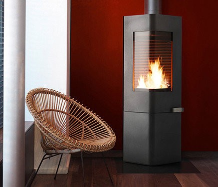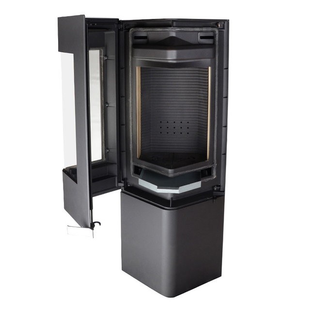 Угловая чугунная печь-камин Moai выполнена из толстого чугуна и оснащена большим угловым стеклом, через которое открывается восхитительный вид на пламя.