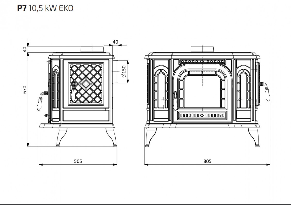 Чугунная печь KAWMET P7 - 10,5 кВт ECO с отличным дизайном и великолепной ценой, используется для отопления помещений, а также как предмет интерьера. Выполнена из чугуна класса EN-GJL-200 под давлением с гладкими стенками без пор и обработки. Для удобства обслуживания и загрузки дров с боку печи предусмотрена дополнительная боковая дверца с размерами загрузочного проёма 22х18 см. Выход дымовых газов может быть как вверх так и перемещён на заднюю стенку печи, сверху при этом образуется ровная нагревательная поверхность размером 70х40 см, а дымоходные трубы можно спрятать в стене за печкой.