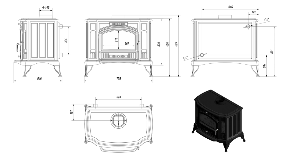 Данная модель полностью выполнена из чугуна. Чугун не боится перепадов температур и не изменяет своих физических свойств и геометрических параметров даже при очень высоких температурах. Чугун очень хорошо аккумулирует тепло и еще долго после прогорания дров будет обогревать дом. Ну и конечно долговечность этого металла: чугунные камины могут прослужить 50–70 лет, не требуя особого ухода за ними.