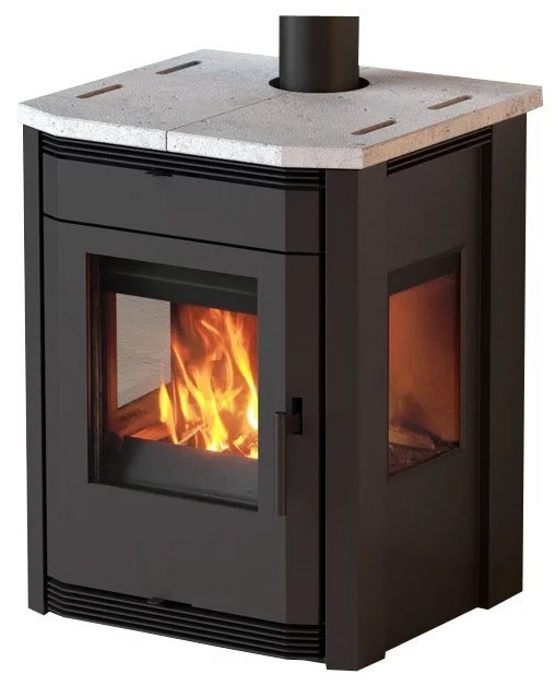 Печь-камин MBS Eva изготовлена из стали, а камера сгорания выложена вермикулитом. Верхняя плита изготовлена из натурального камня.