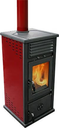 Печь-камин для отопления дома MBS Thermo Vesta Plus красная. Камера сгорания выложена вермикулитом, топка чугунная, площадь отопления 45 - 60 м2