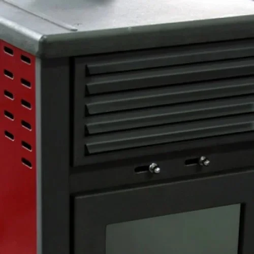 В верхней части печи расположена регулировка подачи воздуха на стекло (система "чистое стекло"), благодаря которой воздушный поток направляется на стекло и, вступая в реакцию горения, выжигает налет сажи на нем и препятствует дальнейшему оседанию копоти на стекле.