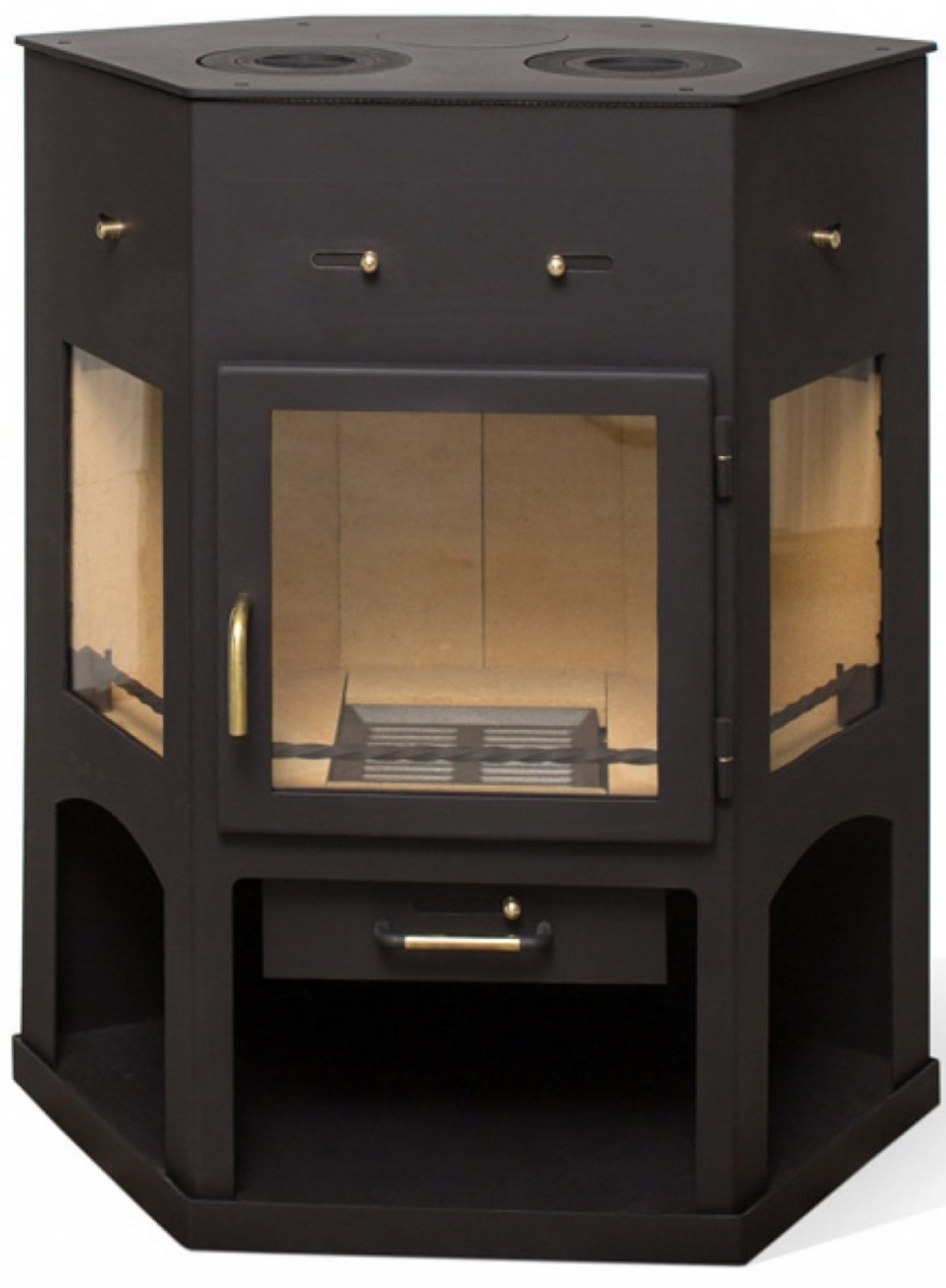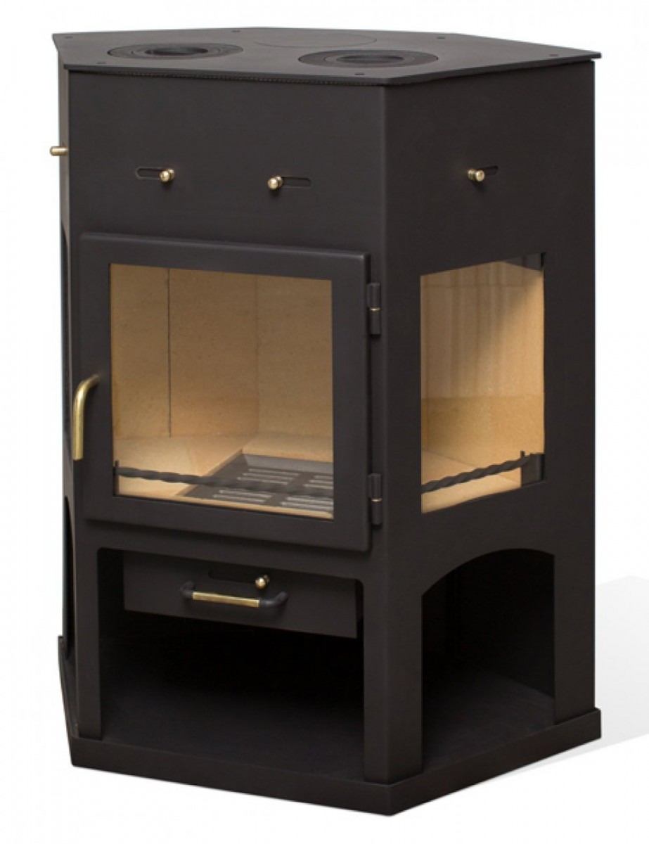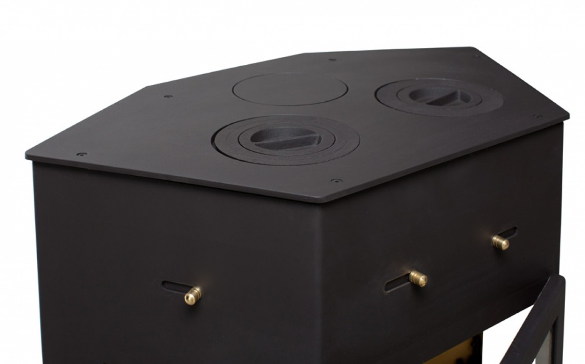 Печь-камин Мета-Бел АОТ 11.0 с плитой имеет высокий КПД, чистое стекло, зольник и колосник для улучшения процесса сгорания и обеспечения максимальной эффективности использования дров.