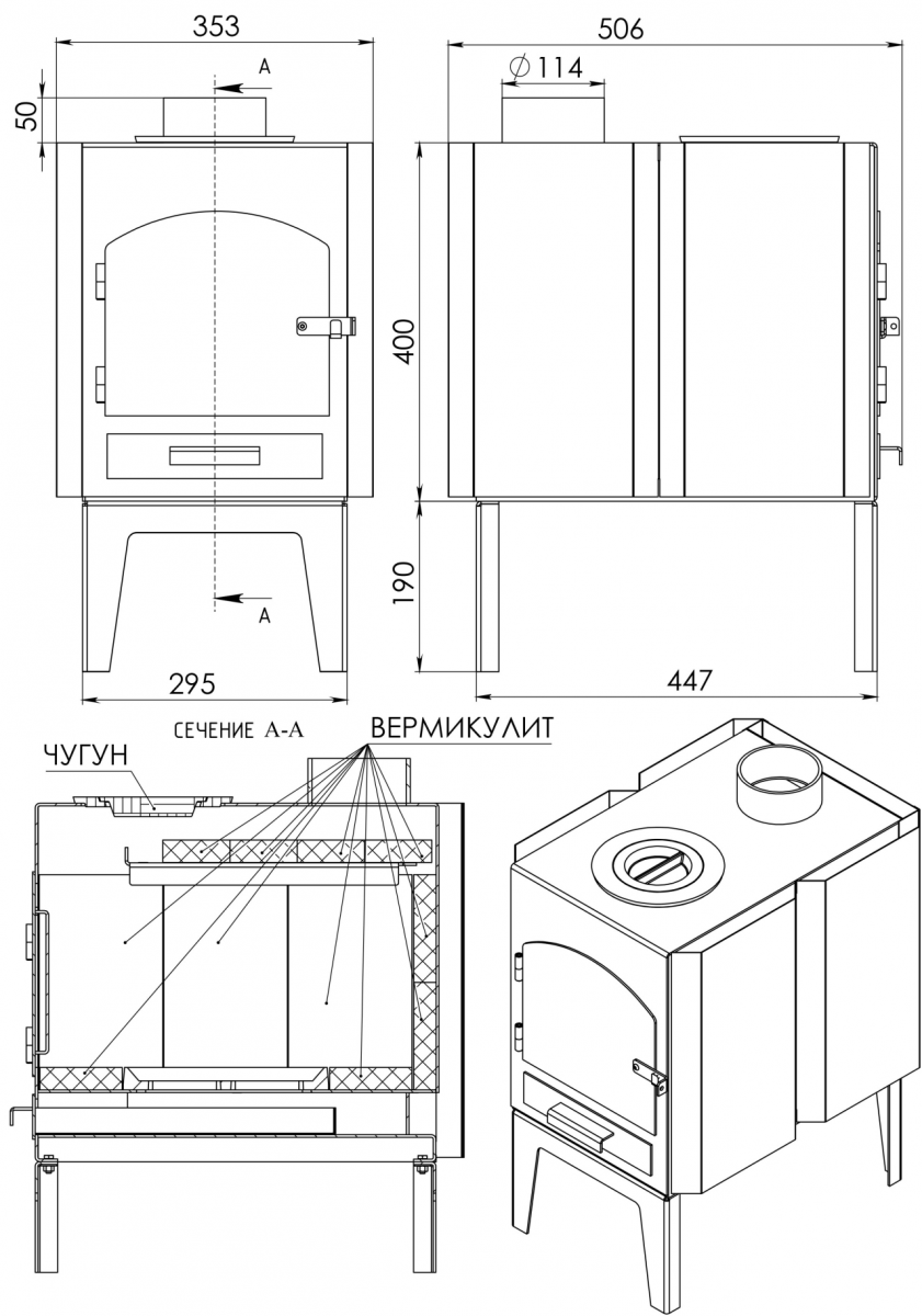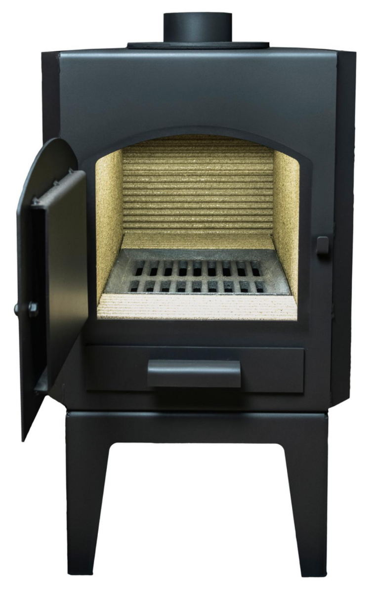 Печь-камин Мета-Бел АОТ 6.0 (в модификации "Ямал") – имеет компактные размеры, двойной корпус и конфорку для приготовления пищи. В отличии от большинства недорогих отопительных печей – в Ямале топочная камера футерована вермикулитом и оснащена большим чугунным колосником. Под топочной камерой расположен зольный ящик, для быстрого и аккуратного удаления золы.