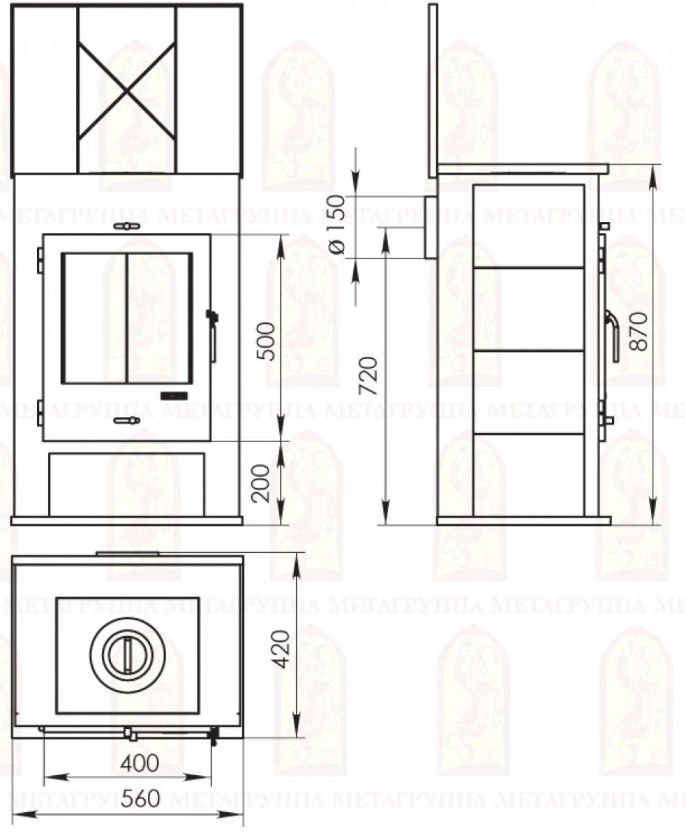 Печь-камин Мета-Бел АОТК 8.0 (в модификации "Охта") – классическая пристенная печь. Верхняя панель оборудована варочной плитой. Высокая дверка высотой 550 мм закрывает зольный ящик и топочную камеру. Идеально подходит для обогрева загородного домика площадью 40-80 м2. Кроме обогрева помещения можно разогреть пищу или вскипятить чайник. Важно! Данная модель может эксплуатироваться с закрытой декоративной крышкой. Плоская со стеклом дверка высотой 550 мм. Подсоединение к дымоходу сзади.