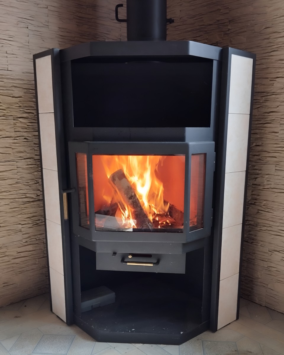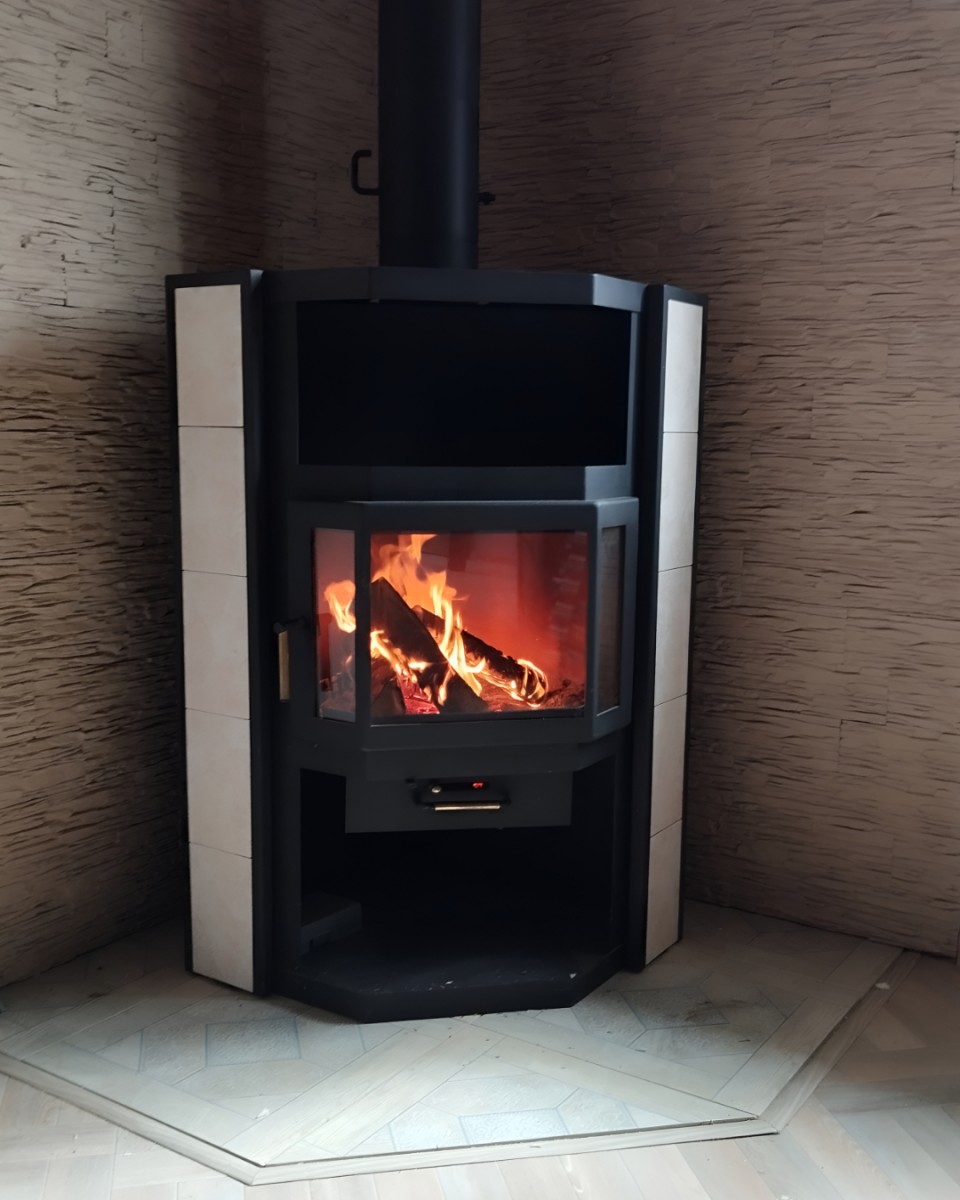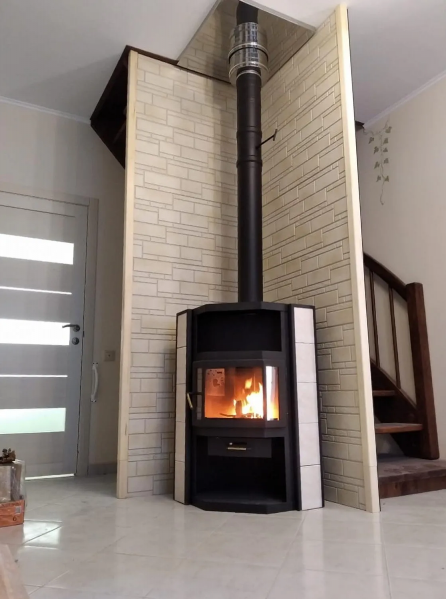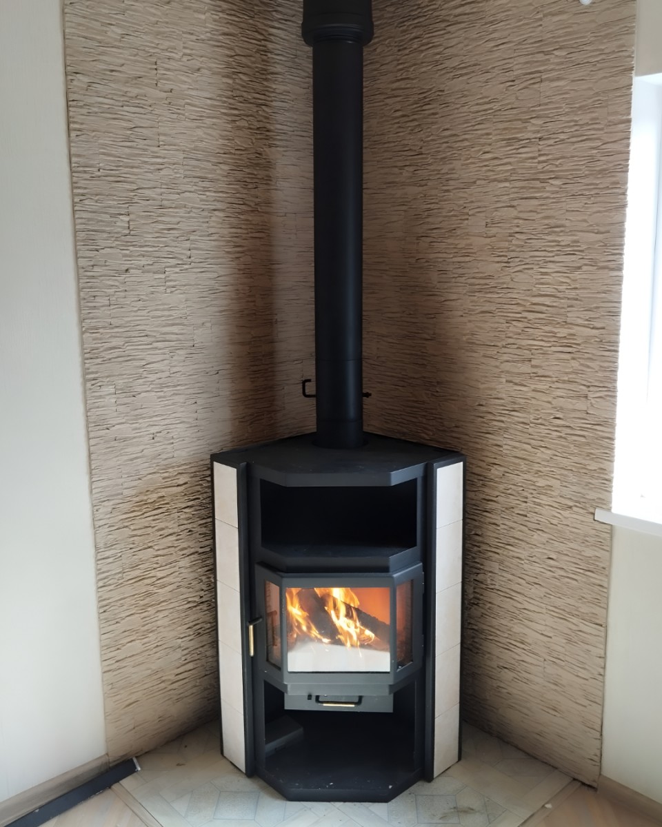 Изготовленная из прочной стали, топка обеспечивает надежность и долгий срок службы. Дверца с стеклом позволяет наслаждаться видом пламени, создавая атмосферу уюта. Печь-камин оснащена каминной топкой с длиной до 50 см, что упрощает процесс загрузки топлива.