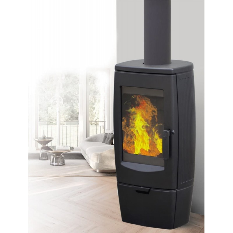 Плоское огнеупорное стекло топки не коптится и не загрязняется за счет отличной работы системы «чистое стекло». На дверце печи есть удобная ручка. Внизу печь укомплектована небольшим, но функциональным закрытым дровником.