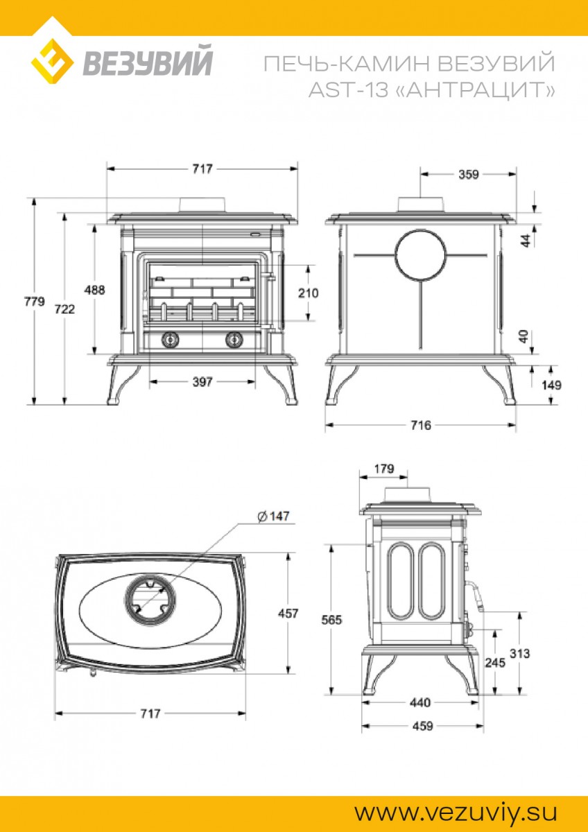Отопительная печь-камин Везувий AST-13 "Антрацит" 13 кВт из жаростойкого чугуна