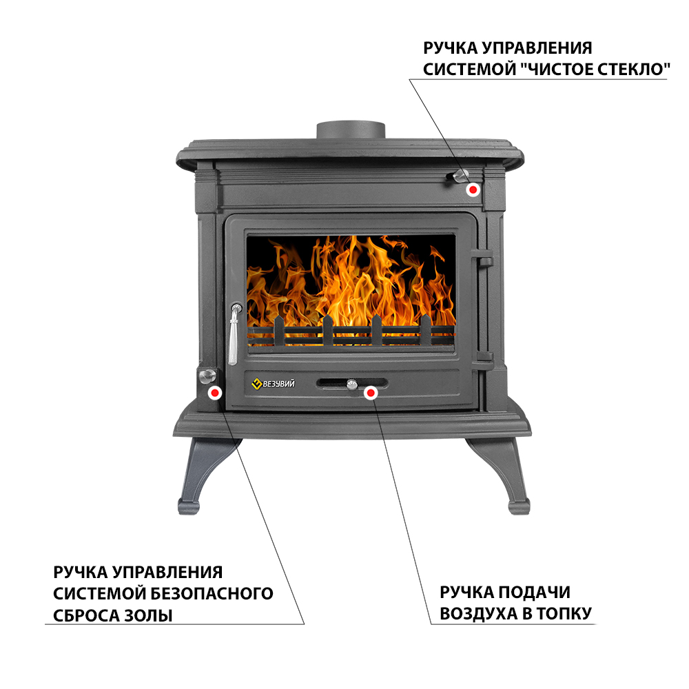 Печь-камин Везувий АST-13К "Антрацит" изготовлена из качественного чугуна с толщиной стенки 8-10 мм. Модель рассчитана на обогрев помещений объёмом до 260 м³.