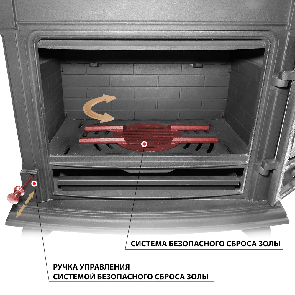 Топочная камера ограничена двойными чугунными стенками сзади и по бокам. Нижняя панель представляет собой колосниковую решётку с поворотным механизмом. Ручка поворотного устройства выходит на переднюю панель печи и позволяет сбрасывать излишки золы и мелких углей в зольный ящик, не открывая двери печи. Дверь изготовлена из чугуна, оснащена большим панорамным стеклом. Чистота стекла во время работы обеспечивается системой подачи воздуха на внутреннюю сторону стекла. Воздух отсекает дымовые газы и пламя от поверхности стекла, предотвращая закопчение и потемнение стекла. Ручка управления системой размещена в правой верхней части передней панели, над дверью. В нижней части двери размещена задвижка для подачи воздуха на первичное горение. Вторичный дожиг в печи-камине обеспечивается двойными боковыми стенками: здесь между стенкой и внутренней облицовкой топки из чугуна есть каналы, идущие из поддувала под нижний край пламегасителя, в зону активного горения. Воздух для вторичного дожига из области размещения зольного ящика поступает в верхнюю часть топки, усиливая горение и повышая теплоотдачу. Зольный ящик коробчатого типа изготовлен из стали и закрывает пространство под колосниковой решёткой. Патрубок дымохода универсальный - со сменным положением, может быть установлен сверху или сзади, в зависимости от размещения печи в помещении. Изящные ножки и литой узор с внешней стороны стенок делают печь-камин AST-13К интересным интерьерным решением, которое отлично впишется в дизайн дома и станет горячим сердцем любого пространства.