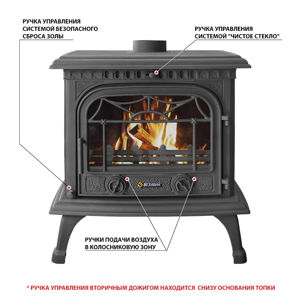 Над дверцей печи-камина расположена система чистое стекло, которая помогает оставаться стеклу чистым. В нижней части дверцы расположены две ручки для регулировки подачи воздуха в колосниковую зону, которые помогают контролировать интенсивность горения. В нижней панели предусмотрена колосниковая решётка, которую можно привести в движение с помощью ручки, которая выведена на корпус печи. за счет этой функции появилась возможность безопасный сбрасывать золу в зольный ящик