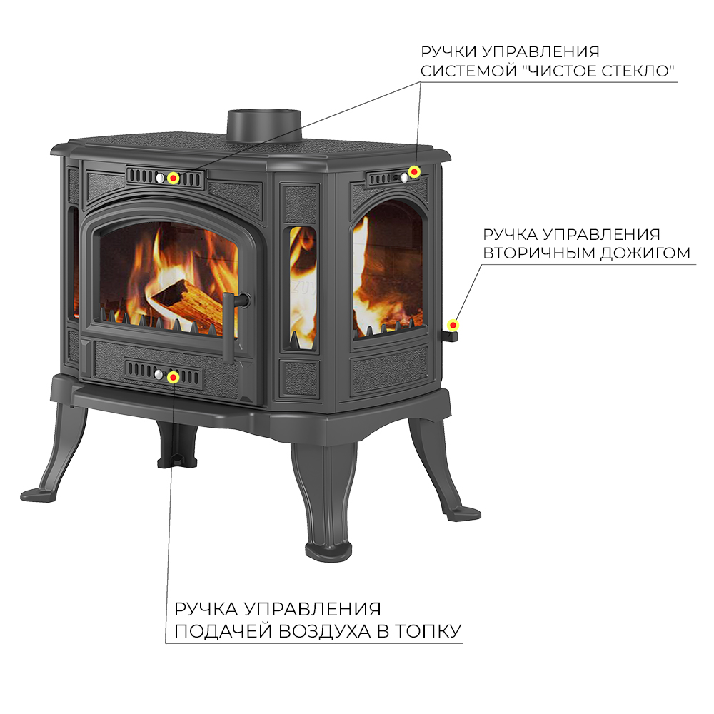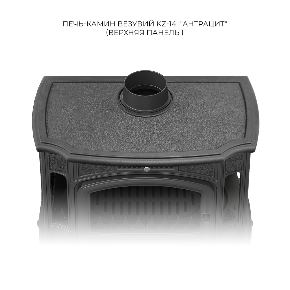 Печь-камин Везувий KZ-14SР "Антрацит" изготовлена из качественного чугуна с толщиной стенки 8-10 мм. Модель рассчитана на обогрев помещений объёмом до 280 м³.Топочная камера с двойными чугунными стенками. В нижней панели предусмотрена колосниковая решётка. Дверь изготовлена из чугуна и оснащена большим панорамным стеклом в виде арки. С двух сторон от двери установлены две стеклянные вставки. На модели KZ-14Р по бокам установлены стекла. Чистота стекла во время работы обеспечивается системой подачи воздуха на внутреннюю сторону стекла. Воздух отсекает дымовые газы и пламя от поверхности стекла, предотвращая закопчение и потемнение стекла. На моделях KZ-14 , KZ-14S ручка управления системой размещена в верхней части передней панели, над дверью у KZ-14Р с боку над стеклом. В нижней части двери размещена ручка задвижки для подачи воздуха на первичное горение. Вторичный дожиг в печи-камине обеспечивается двойной задней стенкой: здесь между стенкой и внутренней облицовкой топки из чугуна есть канал, идущий из поддувала под нижний край пламегасителя, в зону активного горения. Воздух для вторичного дожига поступает в верхнюю часть топки, усиливая горение и повышая теплоотдачу. Вторичный дожиг регулируется заслонкой, расположенной на задней стенке печи-камина. Ручка управления заслонкой находится справа. Зольный ящик коробчатого типа изготовлен из стали и закрывает пространство под колосниковой решёткой. Патрубок дымохода – универсальный, со сменным положением. Он может быть установлен сверху или сзади, в зависимости от размещения печи в помещении.
