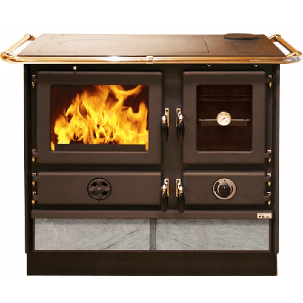 Плита на дровах предназначена для отопления помещения и приготовления пищи на варочной поверхности и в духовом шкафу. В модификации Thermo плиту можно подключить к системе отопления дома. Объем водяного контура 19л. Мощность, которую печь отдает на нагрев теплоносителя равна 10,1 кВт. Мощность, которую печь отдает на обогрев воздуха в помещении также равна 6,2 кВт. Таким образом общая мощность составляет 16,3 кВт.