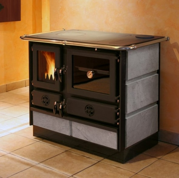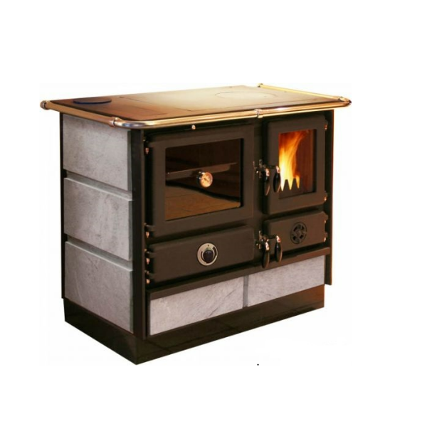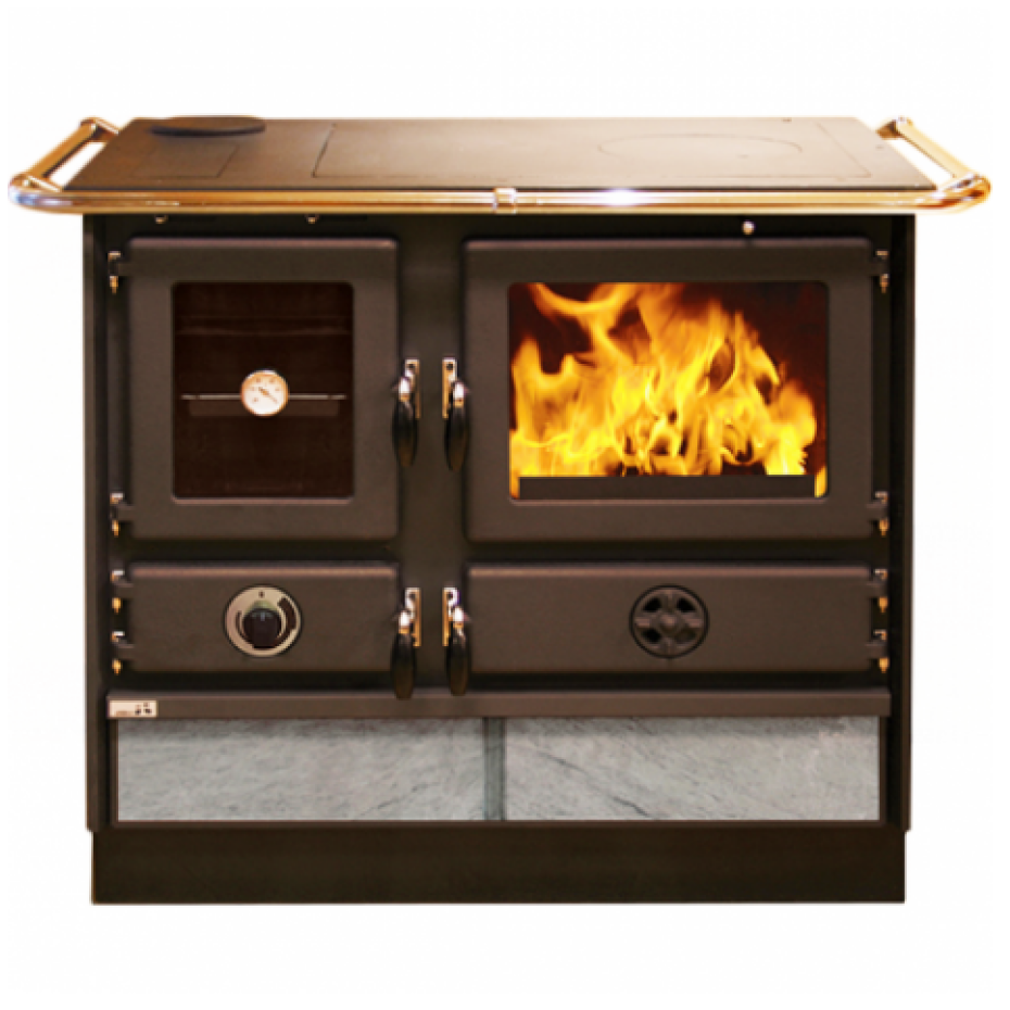 Плита на дровах предназначена для отопления помещения и приготовления пищи на варочной поверхности и в духовом шкафу. В модификации Thermo плиту можно подключить к системе отопления дома. Объем водяного контура 19л. Мощность, которую печь отдает на нагрев теплоносителя равна 10,1 кВт. Мощность, которую печь отдает на обогрев воздуха в помещении также равна 6,2 кВт. Таким образом общая мощность составляет 16,3 кВт.