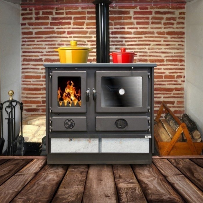 Печь оснащена большой чугунной плитой с одной конфоркой и стальным эмалированным духовым шкафом для приготовления пищи. По периметру варочной поверхности расположен хромированный ограничитель для защиты от ожогов. В нижней части печи расположен выдвижной вместительный ящик для хранения посуды или дров.