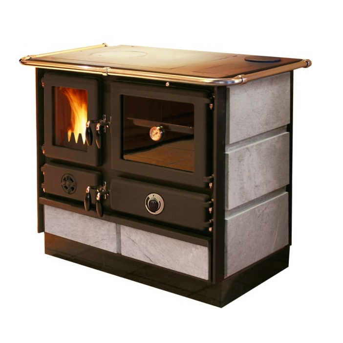 Кухонная печь MBS Thermo Magnum S изготовлена из эмалированной стали, а дверцы, верхняя плита и топочная камера - из чугуна. Боковые панели изготовлены из натурального камня талькохлорита, который имеет привлекательный внешний вид, а также славится своими теплонакопительными свойствами.