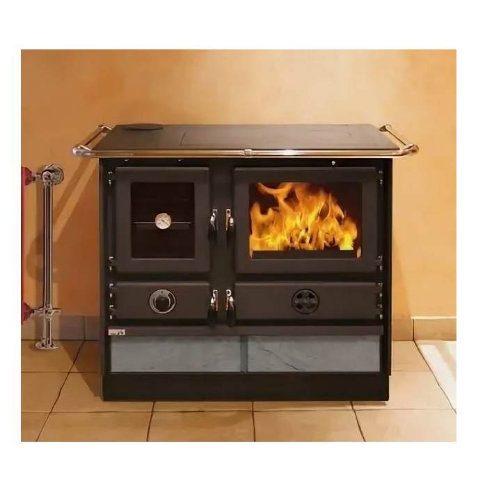 Печь оснащена большой чугунной плитой с одной конфоркой и стальным эмалированным духовым шкафом для приготовления пищи. По периметру варочной поверхности расположен хромированный ограничитель для защиты от ожогов. В нижней части печи расположен выдвижной вместительный ящик для хранения посуды или дров.