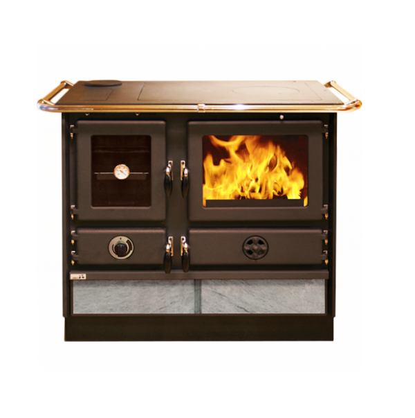Печь оснащена большой чугунной плитой с одной конфоркой и стальным эмалированным духовым шкафом для приготовления пищи. По периметру варочной поверхности расположен хромированный ограничитель для защиты от ожогов. В нижней части печи расположен выдвижной вместительный ящик для хранения посуды или дров.