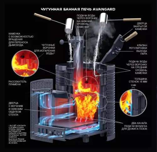 Одной из главных особенностей этой печи является дверца закрытой каменки с клапаном регулировки подачи пара. Благодаря этому механизму можно легко управлять уровнем влажности в бане, а также регулировать температуру за счет количества воды, которую можно заливать на каменку. Дверца закрытой каменки с клапаном регулировки подачи пара делает процесс топки более удобным и безопасным, так как предотвращает попадание горячего пара на руки и одежду.