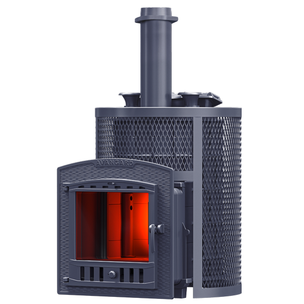 Масса пароиспарителя в печи AVANGARD 35 – 56 кг, и он нагревается прямым контактом с пламенем. У пароиспарителя 2 поверхности с увеличенной рабочей площадью – снизу идёт нагрев огнём, а сверху поддаётся вода для пара. У печи уникальная, массивная каменка с теплонакопительными воронками, для получения легкого пара.