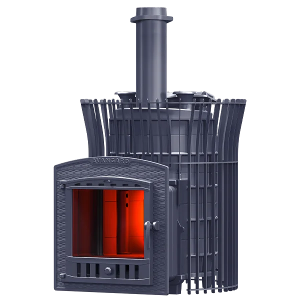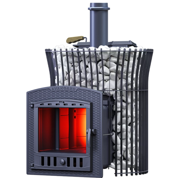 Масса пароиспарителя в печи AVANGARD 35 – 56 кг, и он нагревается прямым контактом с пламенем. У пароиспарителя 2 поверхности с увеличенной рабочей площадью – снизу идёт нагрев огнём, а сверху поддаётся вода для пара. У печи уникальная, массивная каменка с теплонакопительными воронками, для получения легкого пара.