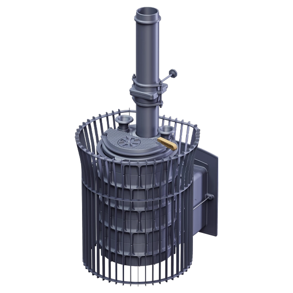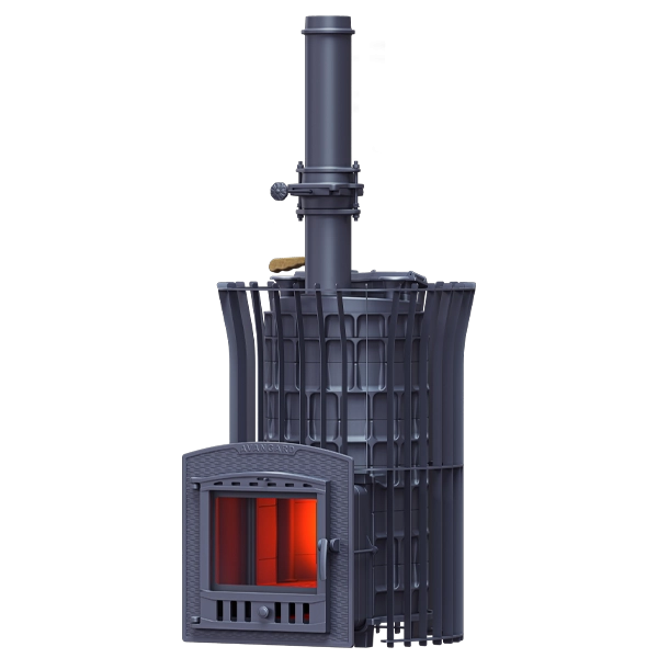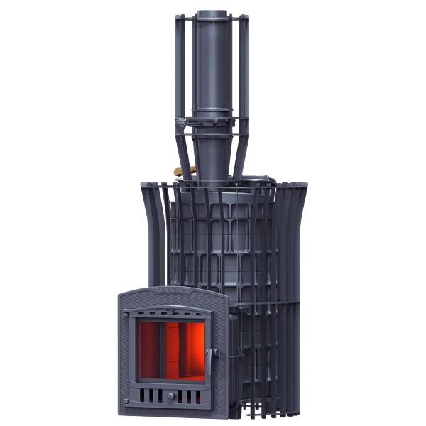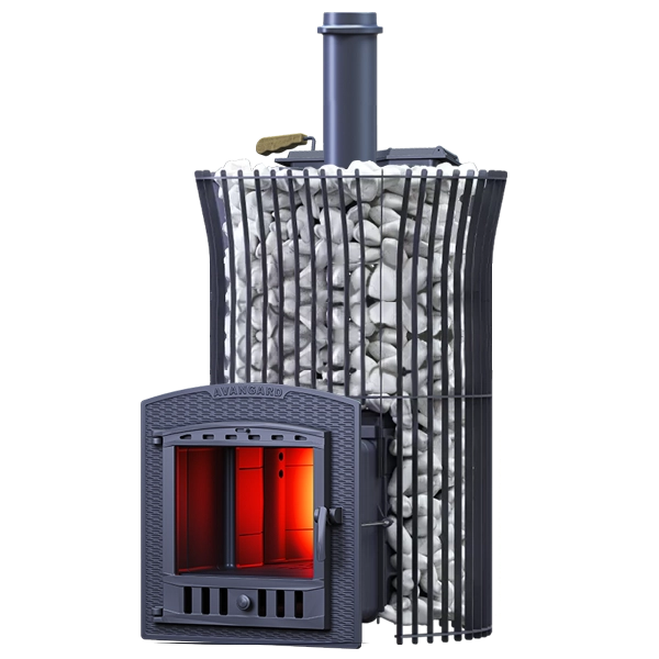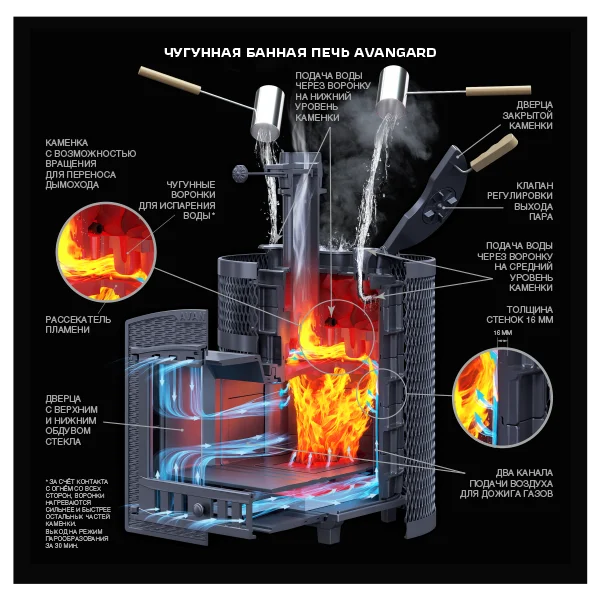 Масса пароиспарителя в печи AVANGARD 62 кг, и он нагревается прямым контактом с пламенем. У пароиспарителя 2 поверхности с увеличенной рабочей площадью – снизу идёт нагрев огнём, а сверху поддаётся вода для пара. У печи уникальная, массивная каменка с теплонакопительными воронками, для получения легкого пара.