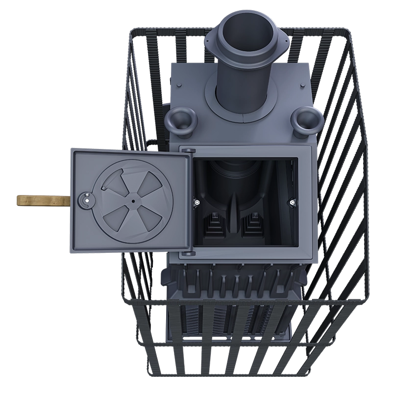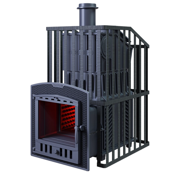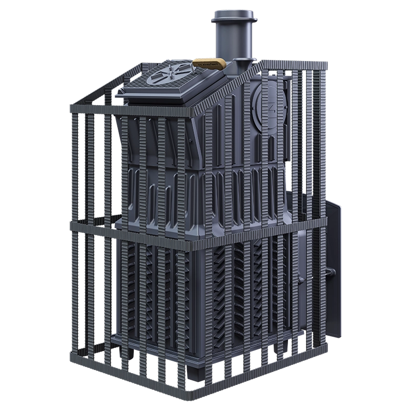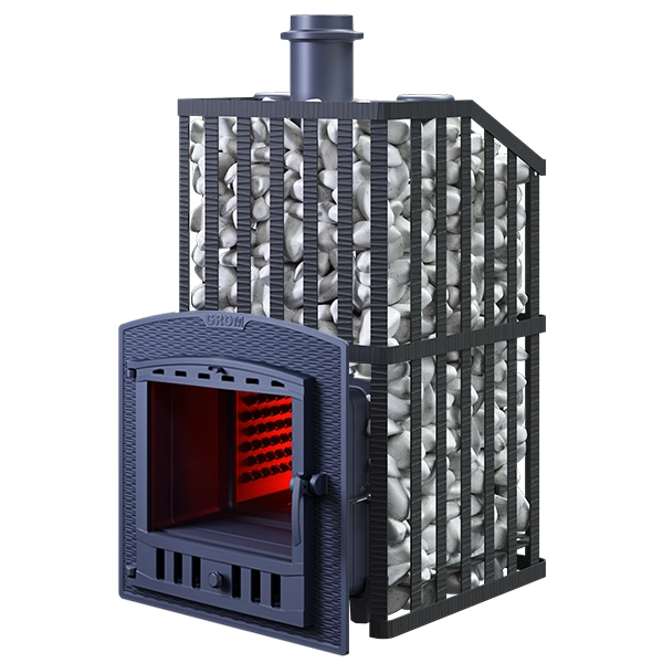 Печь для бани Гром - расширенный комплект печи в сетке с закрытой каменкой - модель повышенной мощности и надежности для коммерческого применения. Основной принцип работы печи – получение пара с теплоёмкой каменки прямого нагрева. Каменка является сводом топки, нагревается с нижней поверхности снабженной теплосъемными шипами для увеличения контакта с пламенем. Увеличенная масса, толщина боковых стенок 14 мм повышают надежность и теплоаккумулирующую способность, а для быстрого нагрева парной боковые стенки оборудованы конвекционными ребрами не только снаружи, но и на внутренней поверхности.