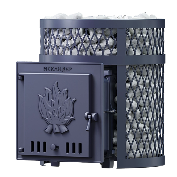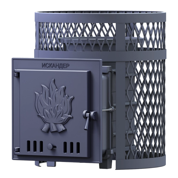 Печь «Искандер 18» с сеткой для камней и глухой дверцой для парных объемом до 18 м. куб. - новый концепт чугунной теплонакопительной банной печи с прямым нагревом заряда.