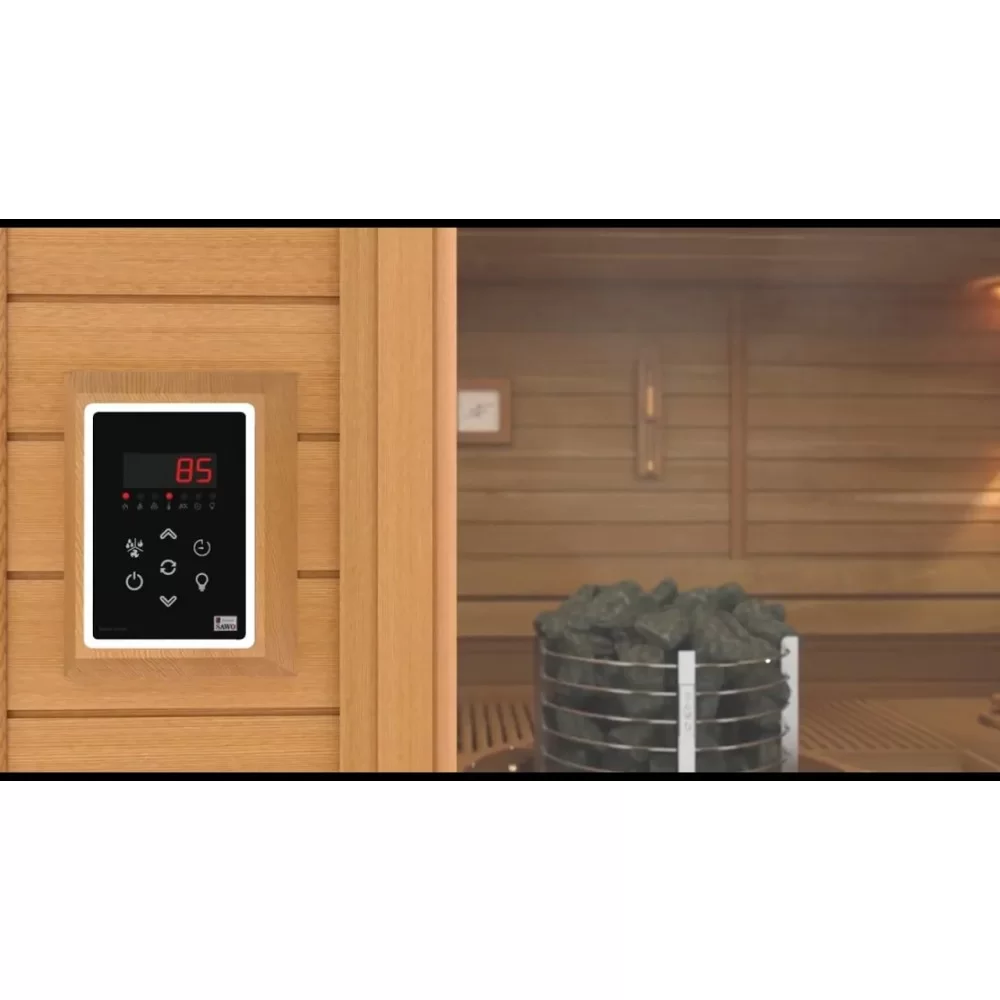 Пользовательский интерфейс Saunova может быть размещен внутри или снаружи сауны! Система оснащена интеллектуальным управлением, которое поочередно отключает нагревательный элемент при достижении заданной температуры. Этот процесс уменьшает колебания температуры, что позволяет нагревательным элементам работать в сбалансированном темпе.