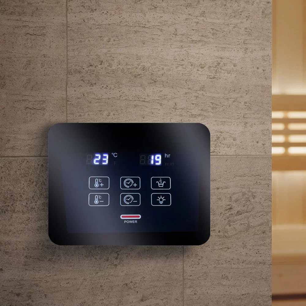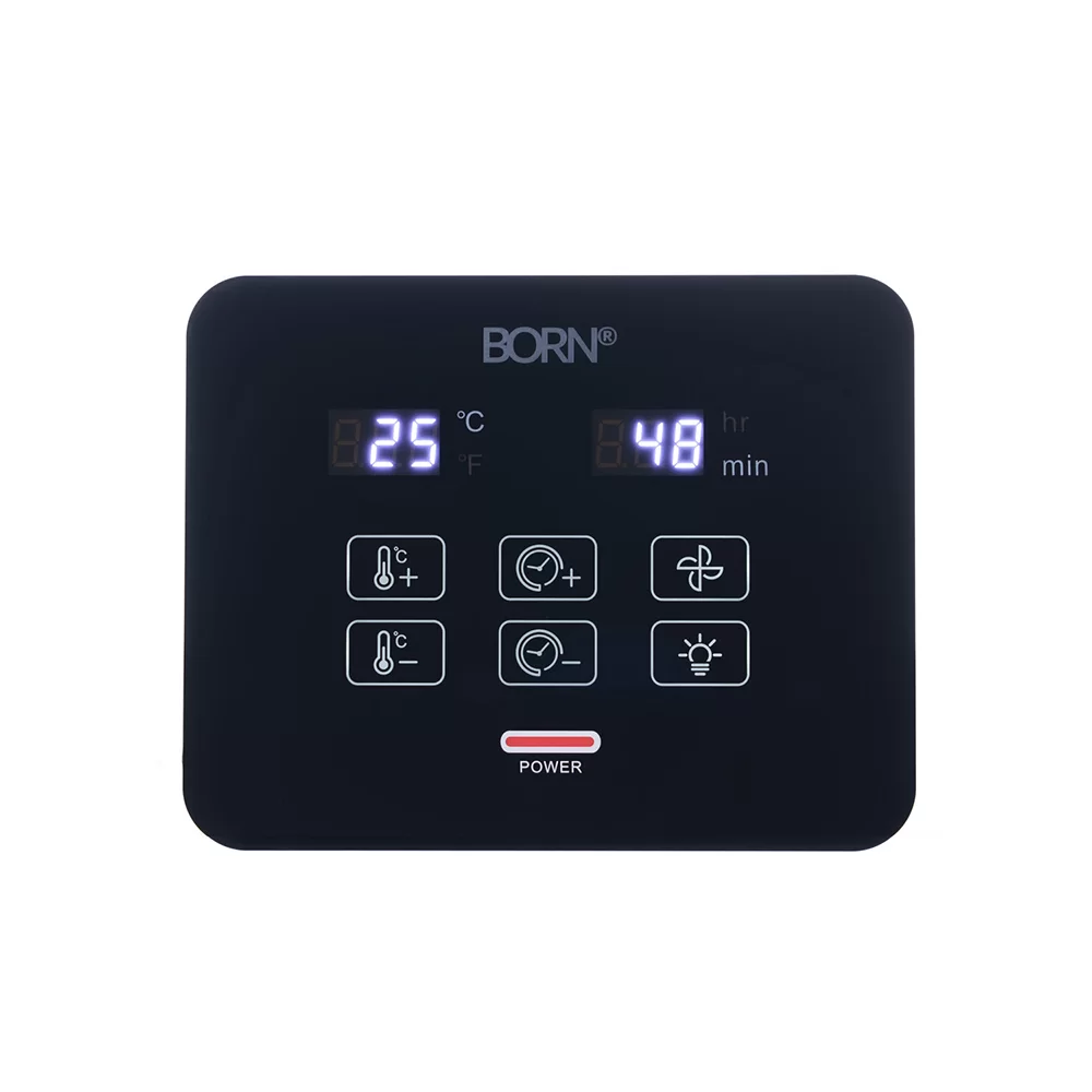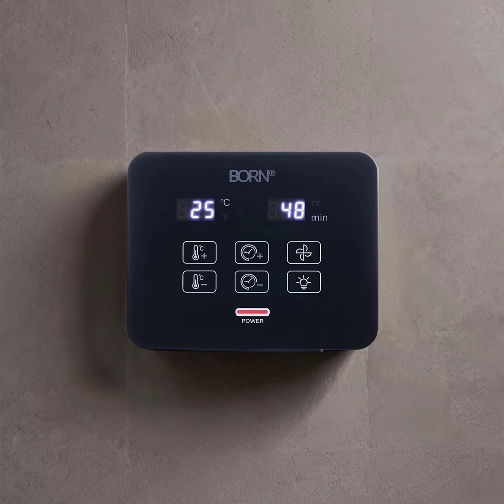 При разработке сенсорной панели управления BORN®CP был сделан упор на гибкость настроек и легкость управления. Отложенный запуск и регулировка продолжительности работы позволят подготовить сауну к использованию к вашему приезду или пробуждению, управление яркостью освещения поможет создать особый уют в парильне, регулировка вентиляции позволит контролировать «тяжесть» воздуха в сауне. Панель оснащена выносным силовым блоком. Возможна настройка управления иным оборудованием в сауне.