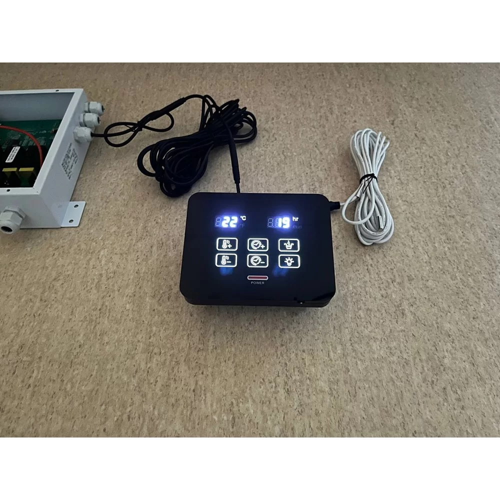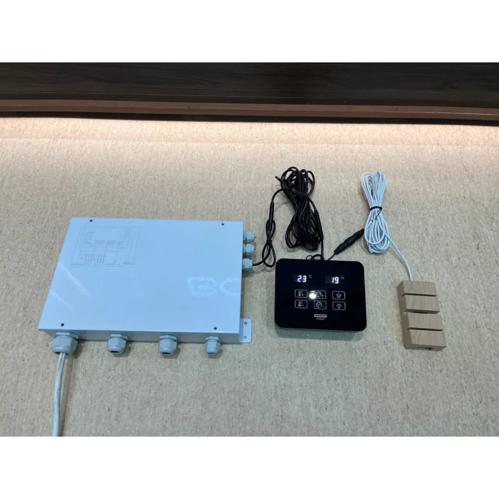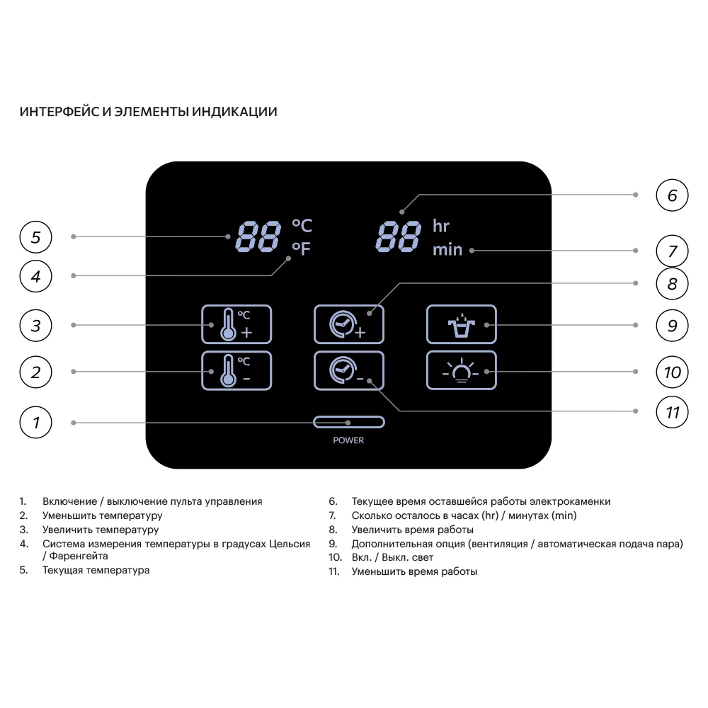 Управляйте каменкой, освещением и скоростью вентиляции в сауне в одно касание. Сенсорное управление, настройка времени работы электрокаменки, отложенный запуск, регуляция температуры в сауне, вкл/выкл света, вентиляции.