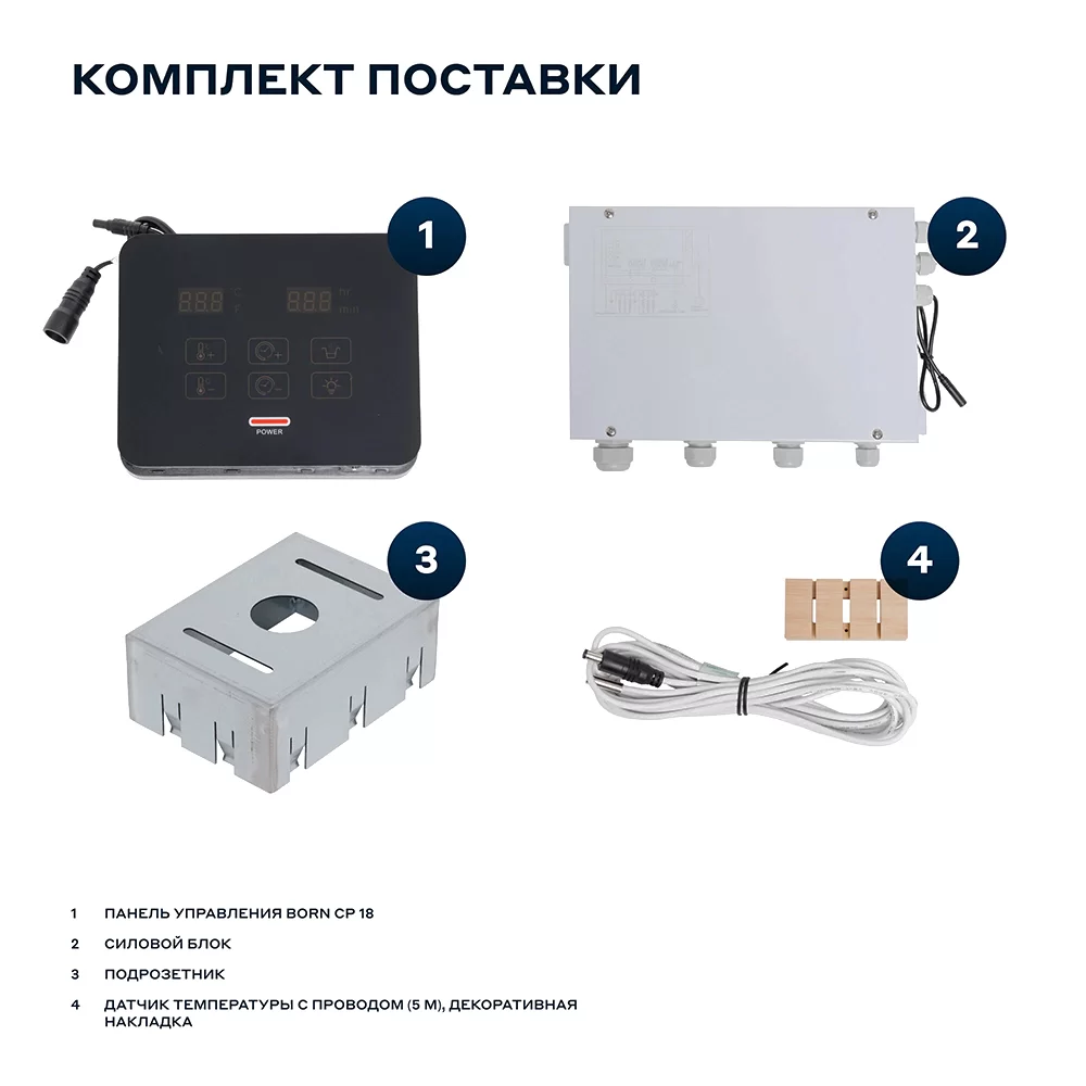 | Комплект поставки | Пульт управления CP BORN - 1 шт., силовой блок мощности - 1 шт., датчик температуры -1 шт. |