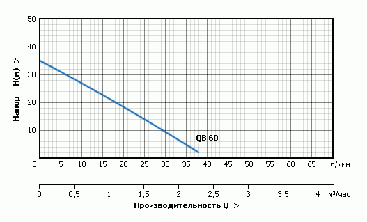 | QB 60 | 0.37 | Напор, Н(м) | 33 | 25 | 21 | 12 | 9 | 4 | - | - |