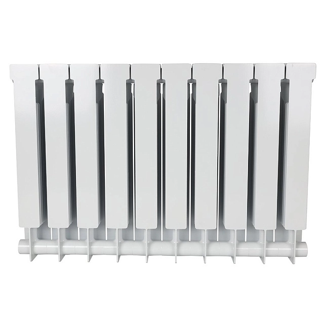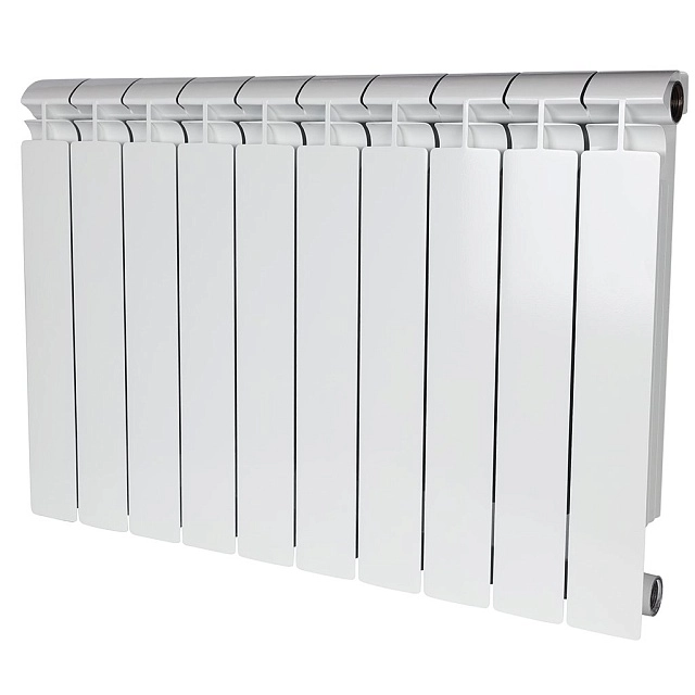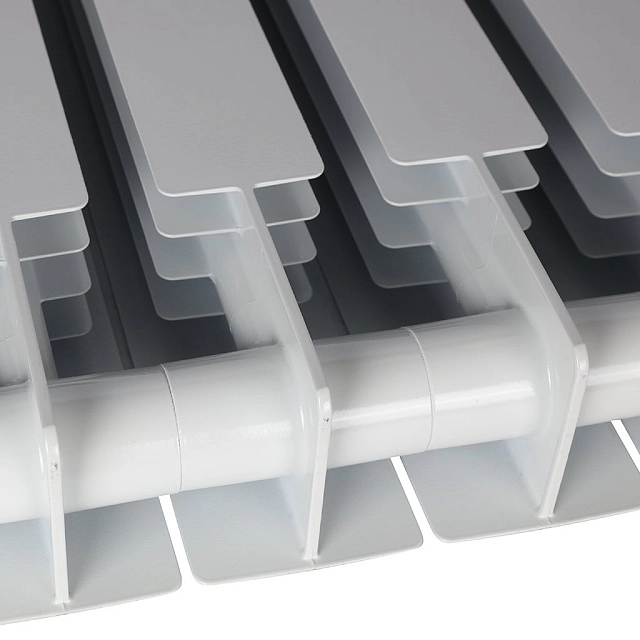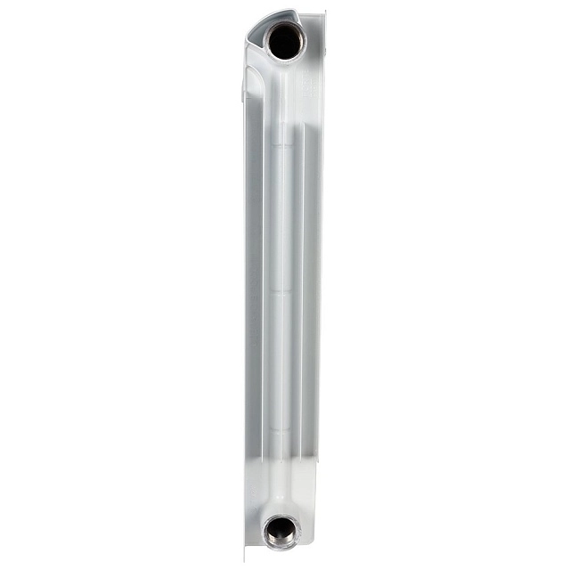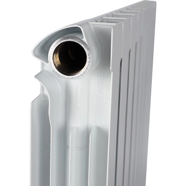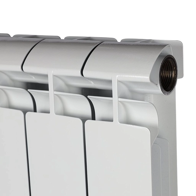 Алюминиевые секционные радиаторы STOUT собираются из отдельных секций, которые изготавливаются из качественного алюминиевого сплава методом литья под давлением. Каждая секция представляет собой единый монолит из двух коллекторов и связывающего их оребрения, внутри которого проходит вертикальный канал овального сечения. Особая форма оребрения и канала обеспечивают высокие теплотехнические показатели радиатора и низкое гидравлическое сопротивление. Внутренняя часть секции алюминиевого радиатора – горизонтальные коллекторы и вертикальный канал, находящиеся в непосредственном контакте с водой. Такая конструкция обеспечивает значительную прочность, что обуславливает долгий срок эксплуатации приборов. В отверстиях коллекторов выполнена трубная резьба размером G 1" (с одной стороны правая, а с другой – левая). Резьба предназначена для соединения секций между собой в радиаторы различной длины с помощью стальных резьбовых ниппелей. Геометрия ниппельных соединений и параметры прокладок из безасбестового материала гарантируют надежную герметичность собранного радиатора.