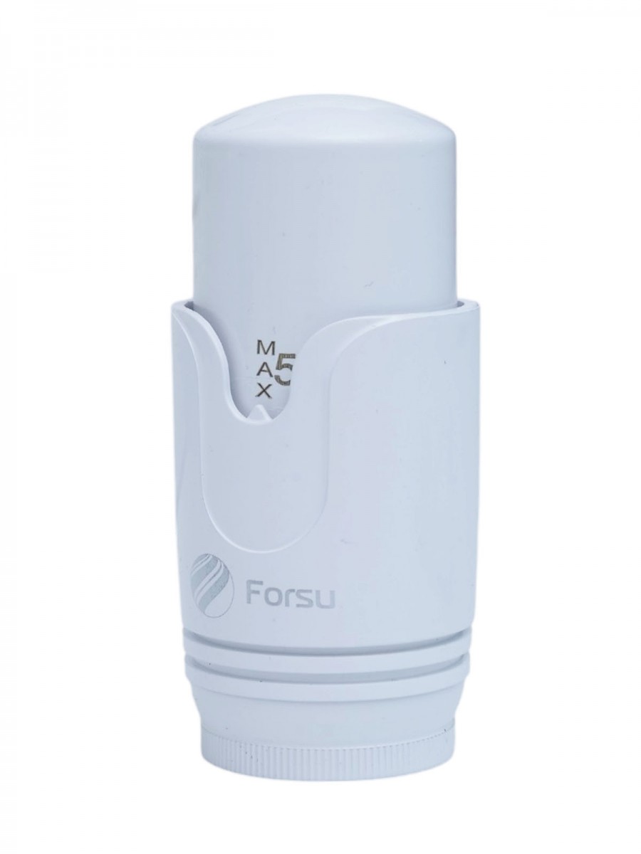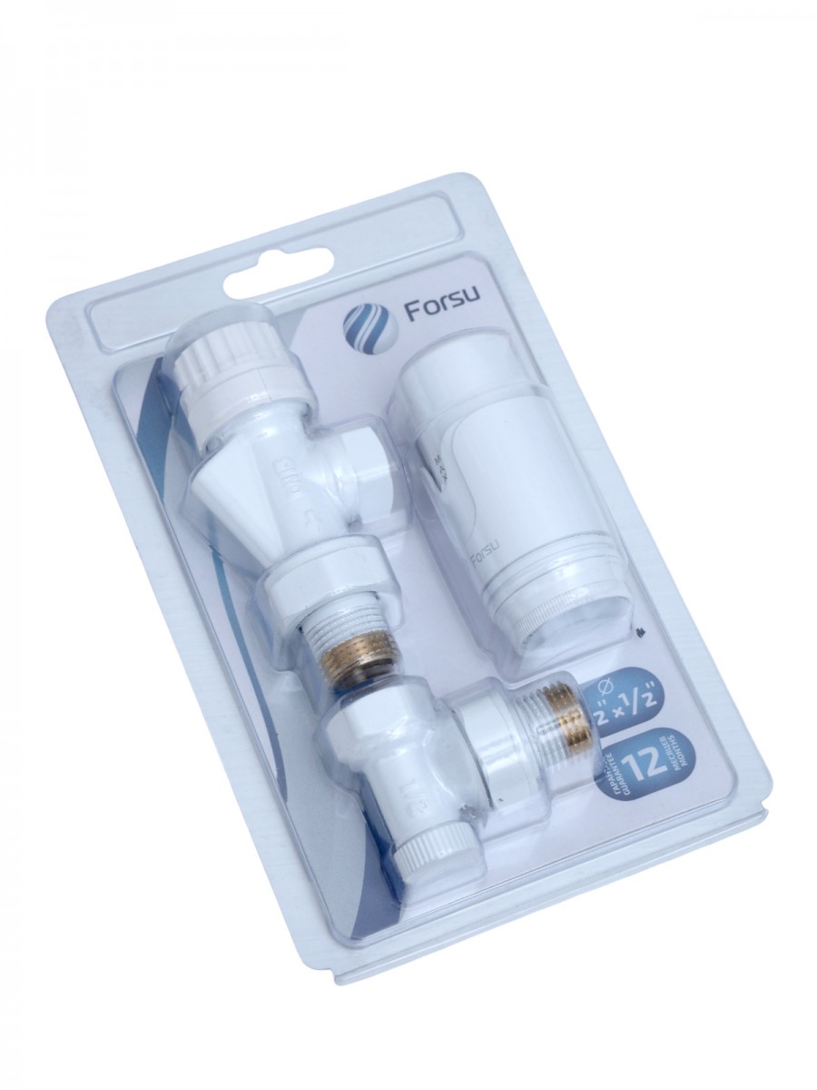 Термостатический комплект запорных кранов для радиаторов в осевом исполнении т.е. после подключения термоголовка будет расположена по оси радиатора, параллельно стене. Осевой комплект кранов Forsu состоит из: термостатическая головка для поддержания заданной температуры; осевой термостатический клапан 1/2 со специальным креплением для установки термоголовки; вентиль запорный 1/2 для отключения радиатора от системы отопления.