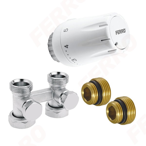 Комплект радиаторный Ferro ZTV07. Элементы комплекта: термостатическая головка GT11 (подходит к термостатическим вкладышам типа Heimeier), присоединительный клапан универсальный (EUROCONUS) для радиаторов типа V.