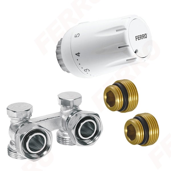 Комплект радиаторный Ferro ZTV07. Элементы комплекта: термостатическая головка GT11 (подходит к термостатическим вкладышам типа Heimeier), присоединительный клапан универсальный (EUROCONUS) для радиаторов типа V.