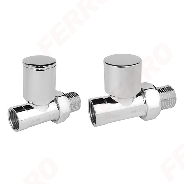Комплект радиаторный прямой хром Ferro ZGB30CR нр1/2''-вр1/2'' для подключения систем отопления. Элементы комплекта: регулировочный клапан прямой 1/2”, отсекающий клапан прямой 1/2”.